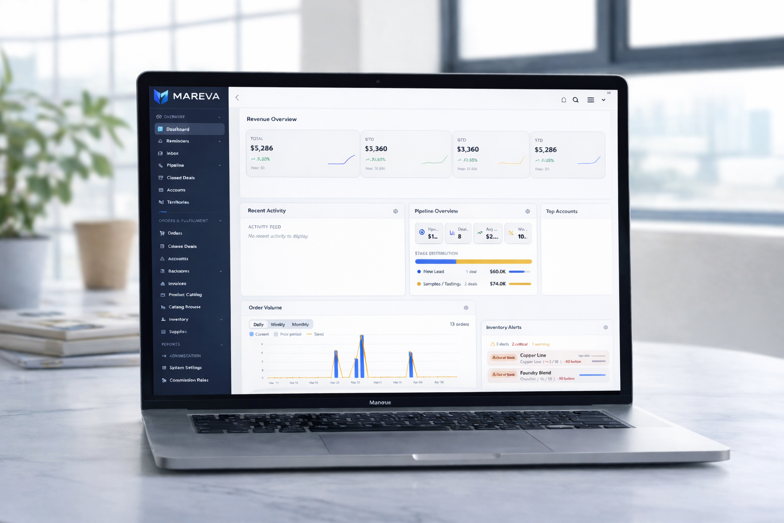 Mareva connects your retailers, sales reps, pipeline, and orders into a single operational command center. From territory management to revenue reporting, the platform gives leadership real-time visibility into how the business is performing.
